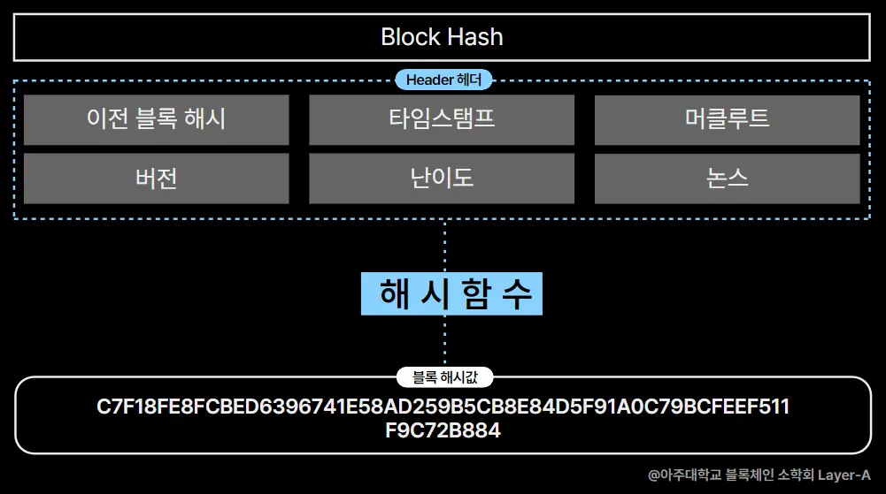 - 블록의 해시값은 블록 헤더의 모든 정보를 해시 함수에 넣어서 만듭니다.