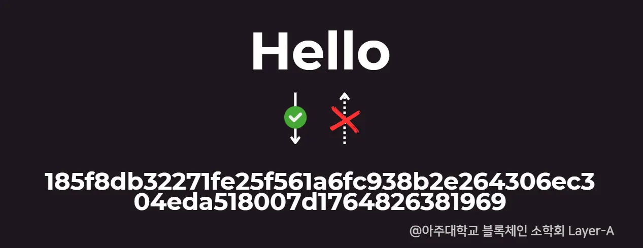 - 일방향성: 해시값은 원래의 데이터로 되돌릴 수 없습니다. 즉, 해시값만 보고서는 어떤 데이터가 입력되었는지 알 수 없습니다.