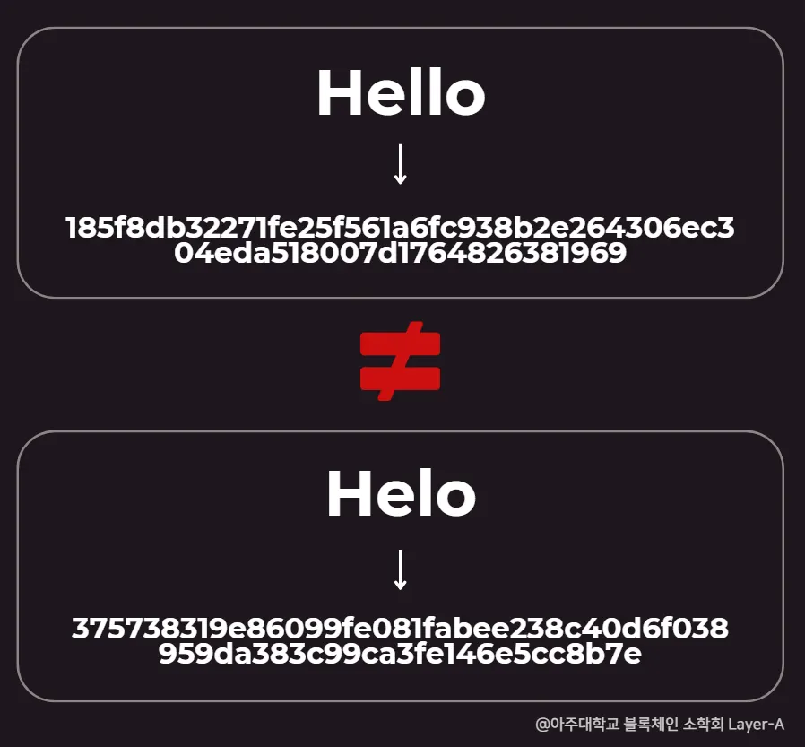 - 예시를 한번 볼까요? ‘Hello’에서 ‘l’하나를 뺀 ‘Helo’를 해시하면, Hello의 해시값과는 전혀 다른 값이 나오는 것을 확인할 수 있습니다. 이처럼 입력값이 조금만 변하더라도 해시값은 전혀 다르게 뒤바뀌는 것을 알 수 있습니다.