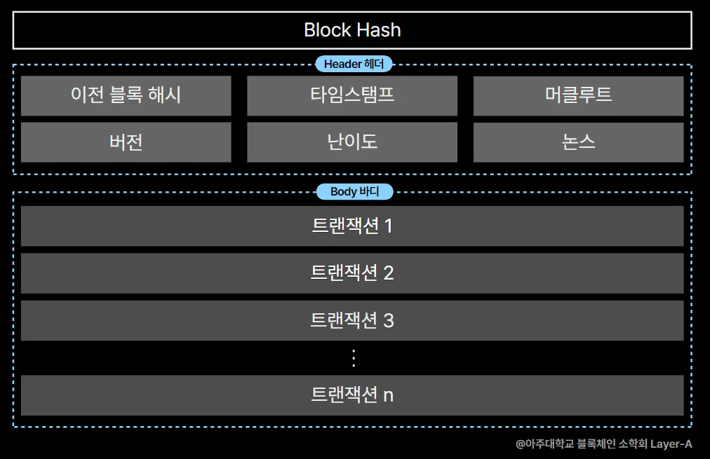 - 블록은 블록 헤더와 블록 바디로 구성되어 있습니다.