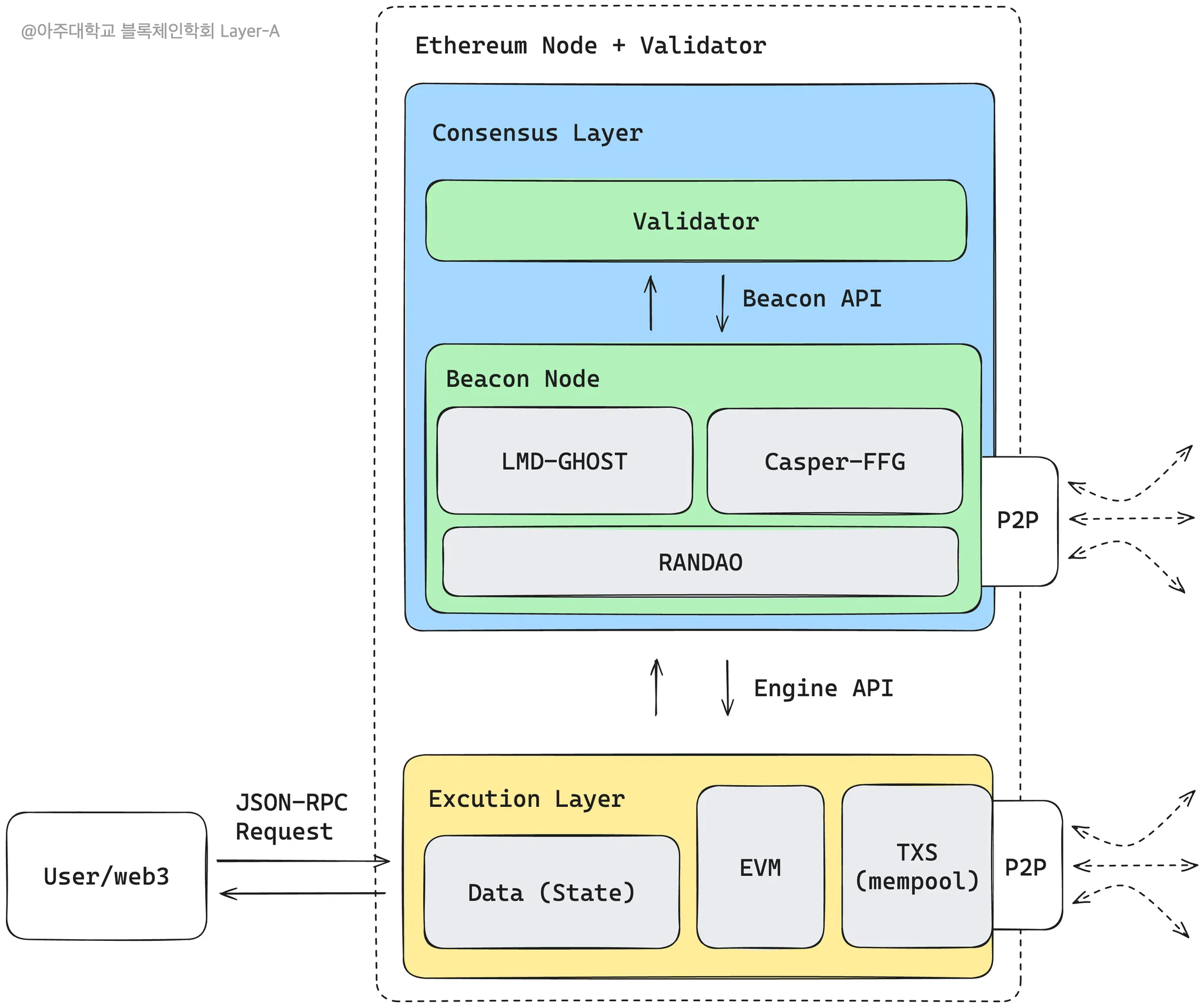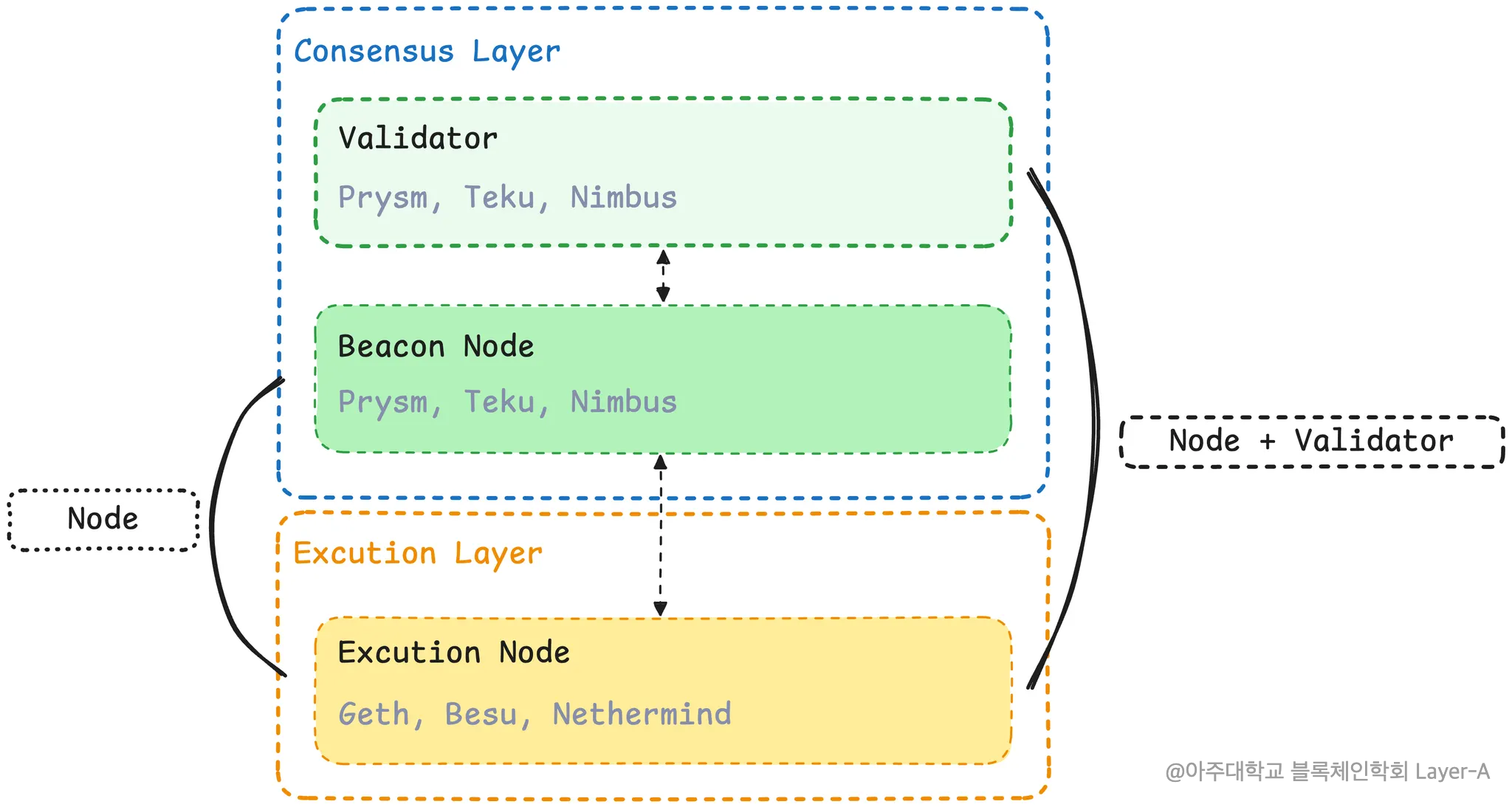 이더리움은 위 그림과 같이 두 계층 합의 레이어(Consensus Layer)와 실행 레이어(Execution Layer)로 구분할 수 있으며 각 계층 안에는 이더리움을 구성하는 비콘 노드(Beacon Node), 실행 노드(Execution Node), 검증자(Validator)가 존재한다.