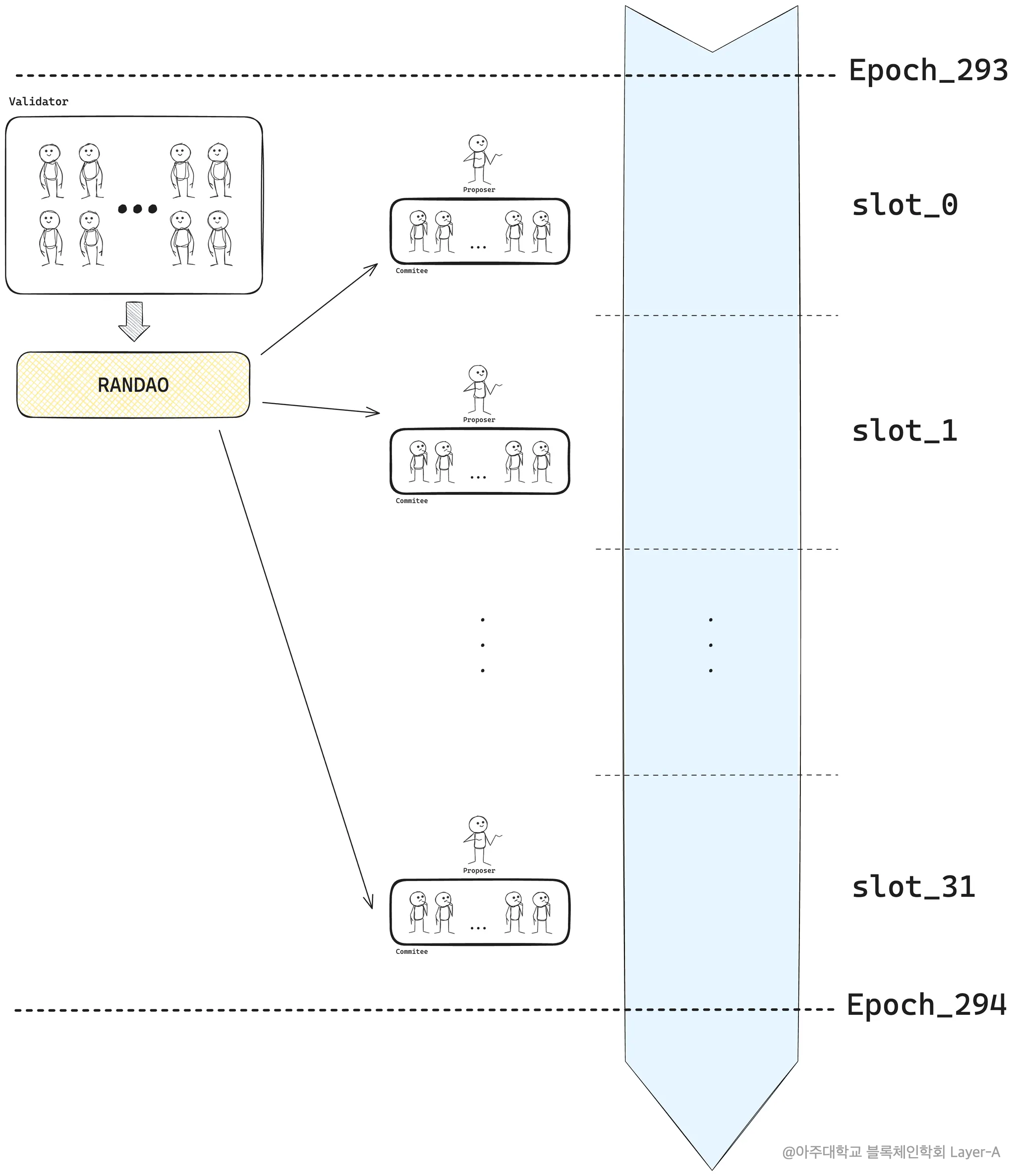 - 에포크 시작 지점에서 셔플링(Shuffing)을 통해 검증자를 무작위로 섞고 위원회를 구성한다.