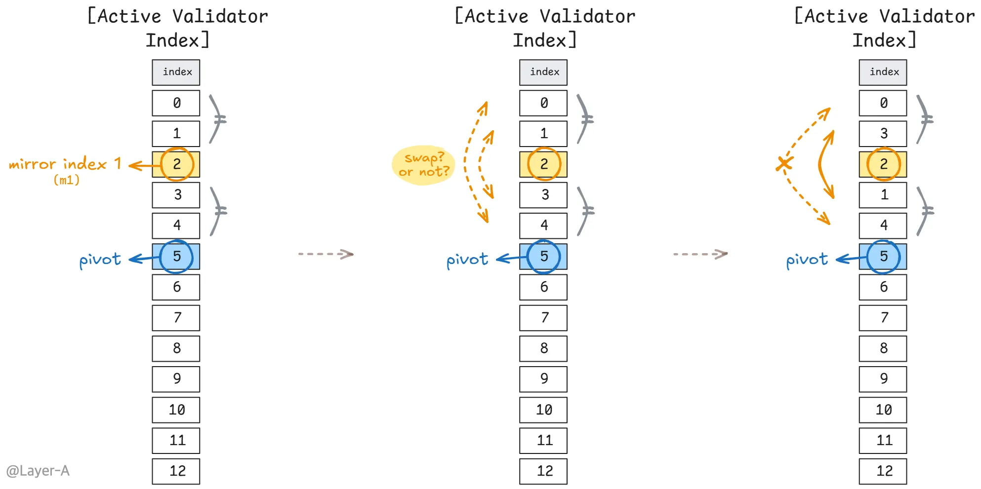 m1과 pivot 사이 모든 검증자 인덱스가 스왑될지 말지 결정되고 나면, 두번째 mirror index가 결정된다. 마찬가지로 pivot 인덱스와 n-1이 대칭이 될 수 있도록 하는 지점이 두번째 mirror index(m2)가 된다. 이후 pivot 인덱스와 m2값 사이의 모든 인덱스가 m2를 기준으로 대칭인 지점의 인덱스와 교환될 지 말 지 결정된다.