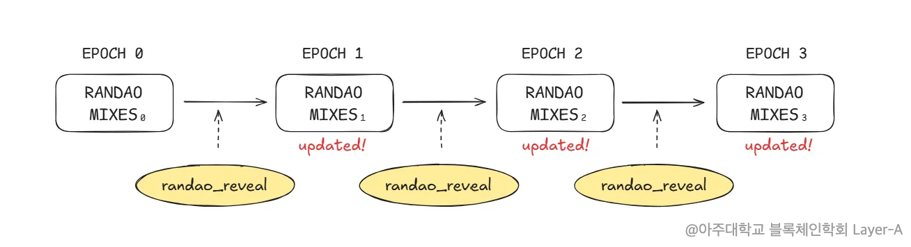 - RANDAO 값은 매 블록이 생성될 때마다 업데이트되며, 이를 통해 이더리움 프로토콜의 무작위성을 유지한다.