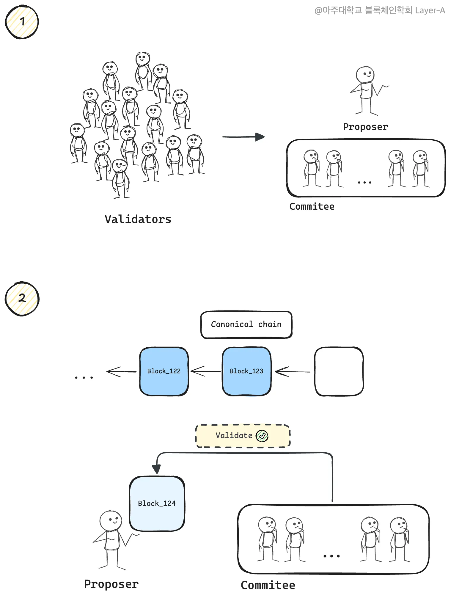 검증자는 블록체인이 유지될 수 있도록 네트워크에 참여해 기여하며 블록 제안자는 검증자 중 무작위로 선택되어 블록을 제안하는 구성원이다. 이더리움은 블록 제안자가 블록을 제안하면 해당 블록을 대상으로 검증자 위원회의 합의 과정을 거쳐 표준 체인에 연결한다.